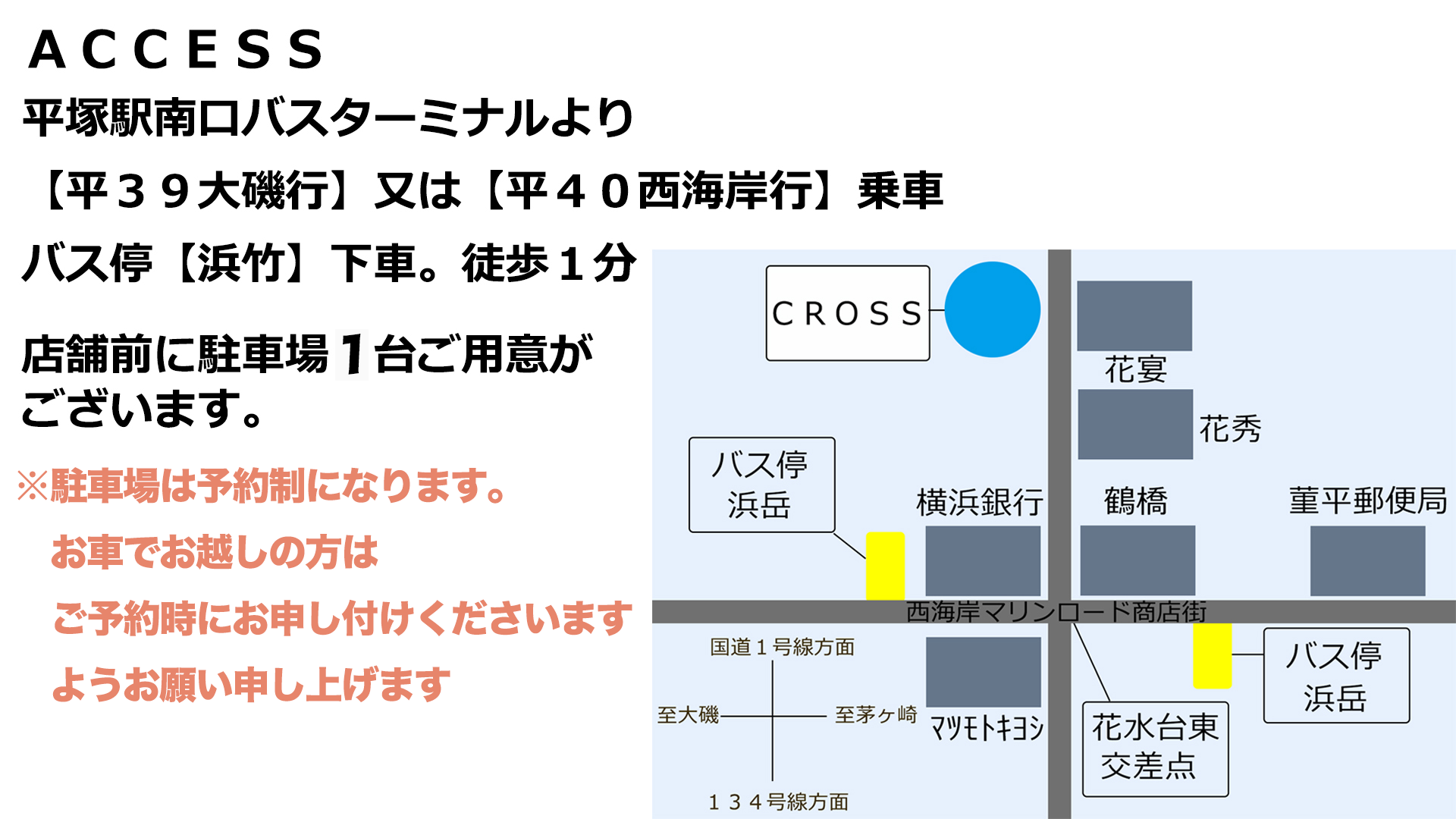 諸事情により駐車場のご利用が1台(店舗前)のみとなります。ご予約時にご来店方法をお伺いいたしますので、駐車場ご利用の方はお申し付けくださいませ。