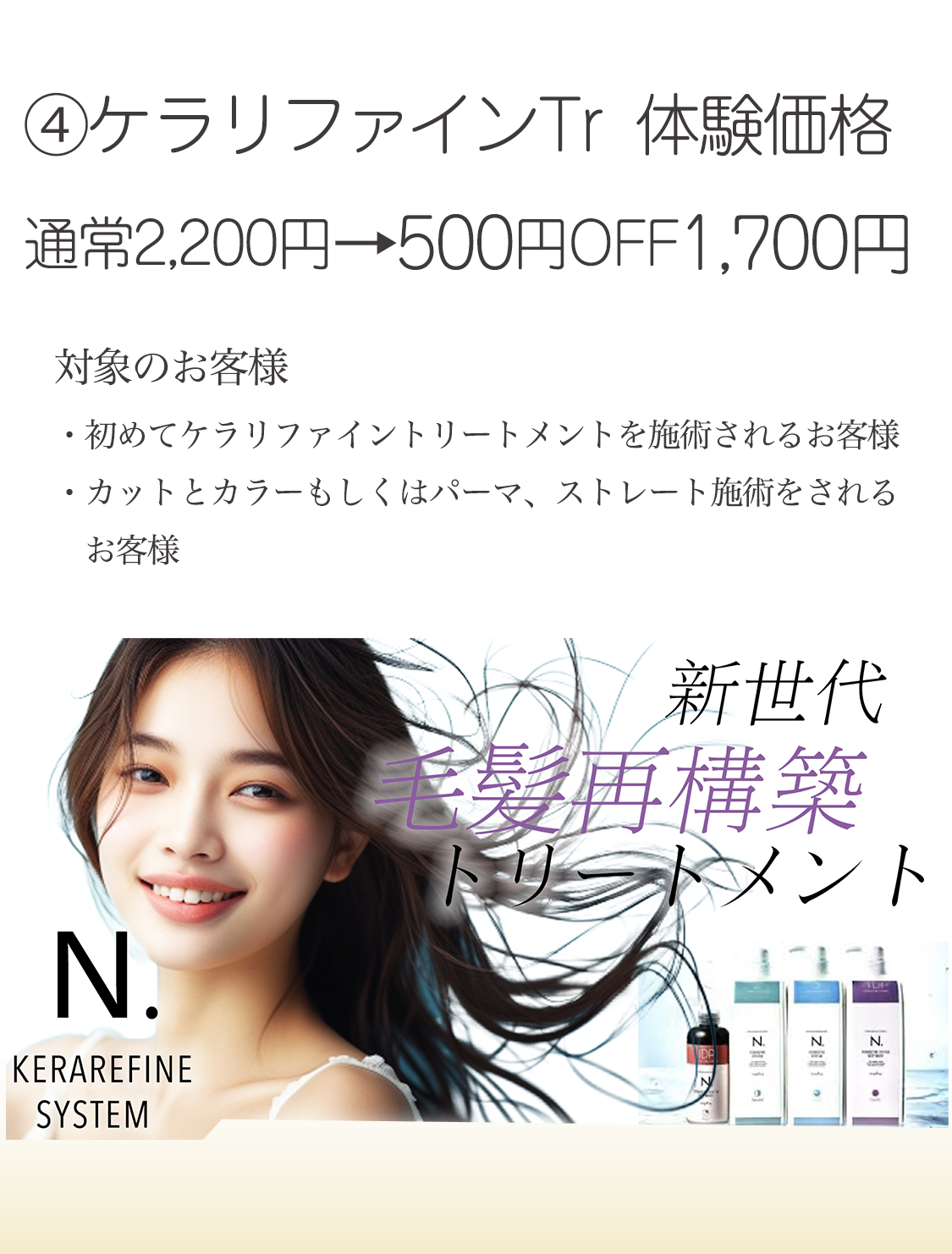 4STEPの業界最高峰トリートメントで傷んだ髪の毛もしっかりケアできます!!※当店で初めてケラリフファインを施術されるお客様が対象となります。