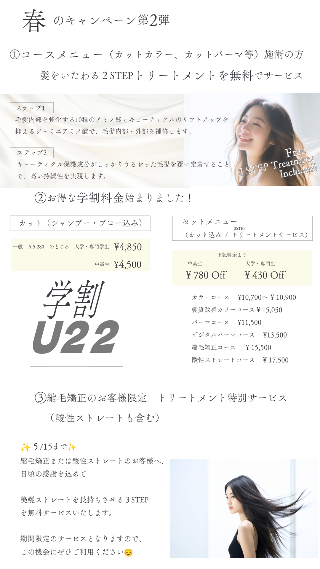 クーポン 14時もしくは15時にご来店限定でバレイヤージュ・ダブルカラー・シャドウルーツがお得に!!一律¥18,000 ロング料金別途¥1,100-2,200 レブプロ スーパーハード導入キャンペーン初めて酸性ストレートされる方は¥500円引き酸性ストレート(カット込み)¥17,500 →¥17,000※ロング料金 別途¥550〜¥1,100ダメージレスにストレートヘアにしたい方におすすめです!