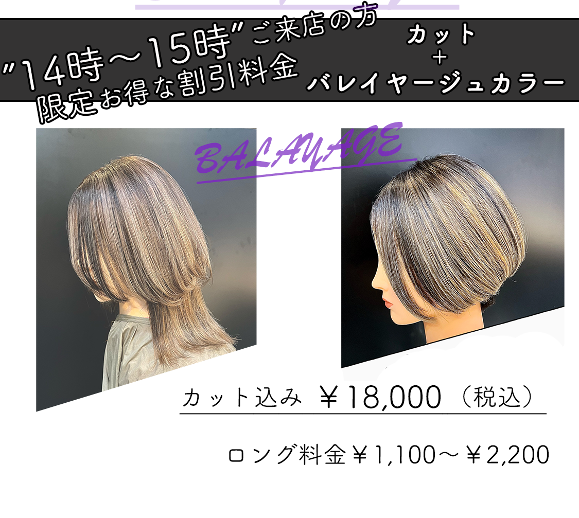 14時もしくは15時にご来店限定でバレイヤージュ・ダブルカラー・シャドウルーツ・グラデーションカラー・白髪ボカシハイライトがお得に!!